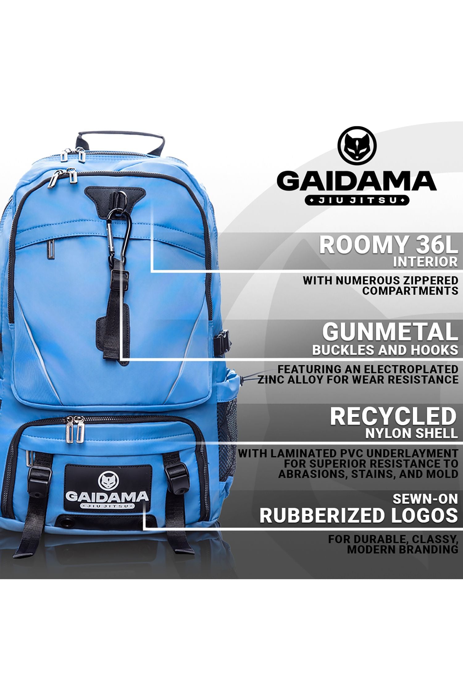 Featuring a high grade composite material with a 100% recycled Nylon exterior shell and a laminated PVC underlayment, these bags are extremely durable, colorfast, waterproof, abrasion resistant, and resistant to stains and mold growth. A large frosted PVC interior zipper pocket offers additional waterproof compartmentalization. Gun metal buckles and hooks feature a high quality electroplated zinc alloy for durability and wear resistance. The roomy 36L interior storage space paired with numerous zippered compartments offers an organized solution for the active lifestyle that's always on the go. So whether you need it to be a backpack for your next travel adventure, a BJJ life staple for school or work, or simply a premium gear bag for your workout routine, Gaidama's High-Capacity Performance Backpack was made to get you there.