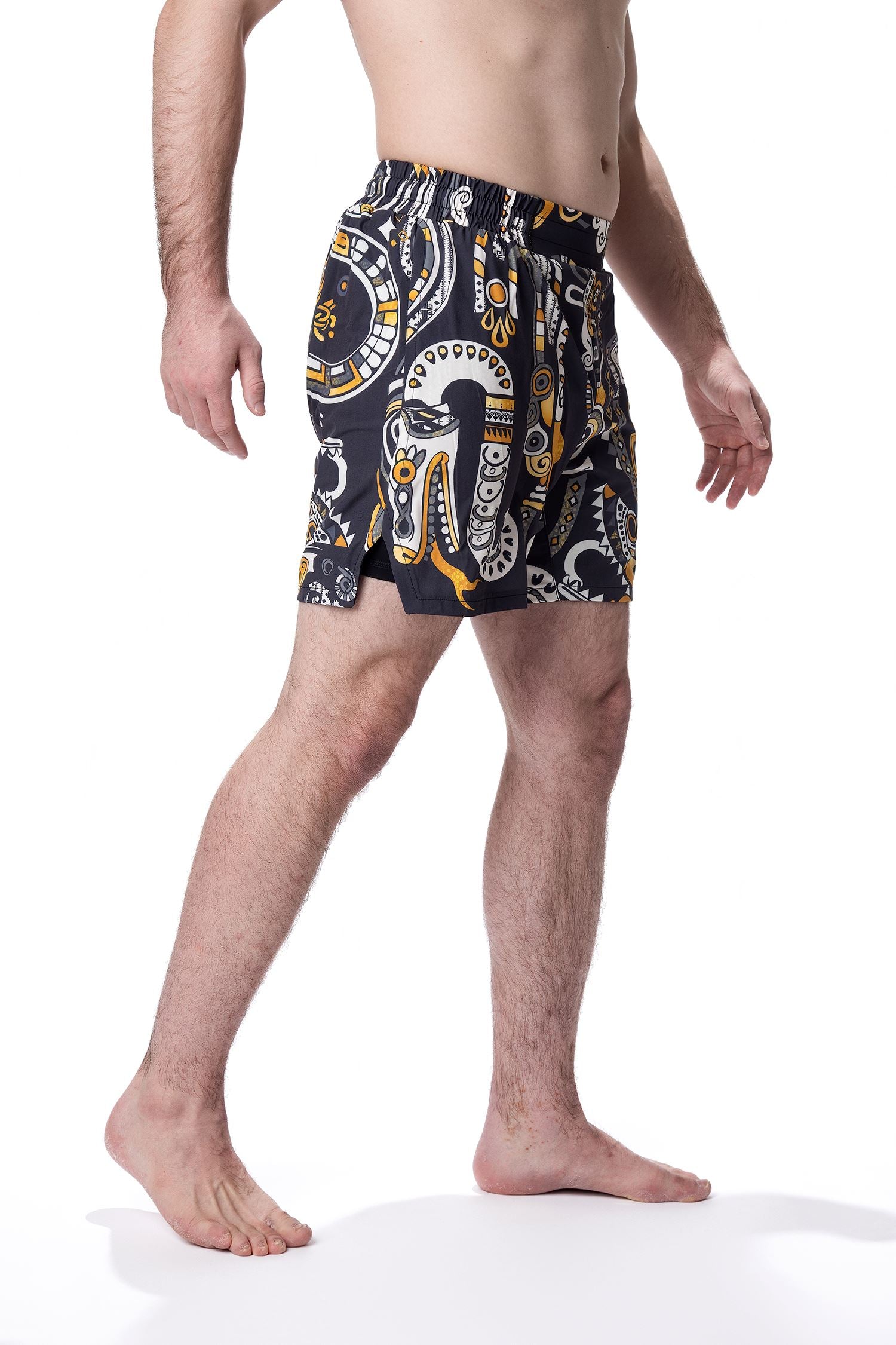 These specialty men’s nogi shorts for men feature fully sublimated graphics designed exclusively for Gaidama that depict powerful serpents inspired by the rattlesnake artwork of Meso-American cultures as the portal between two worlds. A swirling palette of black, gray, and gold creates a bold look infused with raw energy and spiritual depth.